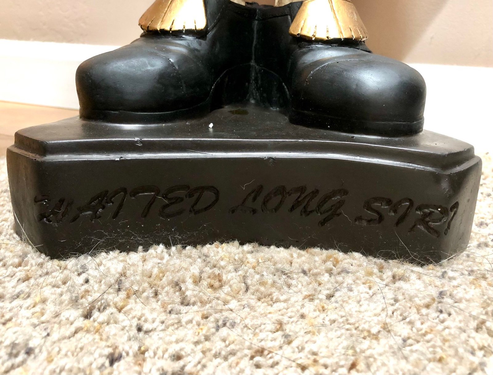 Design Toscano “Bones, the English Butler Pedestal Sculptural Table” by artist Liam Manchester. Clearing out an elder woman’s storage unit. Great condition, except the arm holding the waiter’s tray has been re-glued back on a couple times since it kept detaching. Butler measures 12"W x 14"D x 36"H with a 7.75" diameter serving tray, and weighs 17 lbs. Made of resin, and base reads “Waited long, sir?” Asking $230.