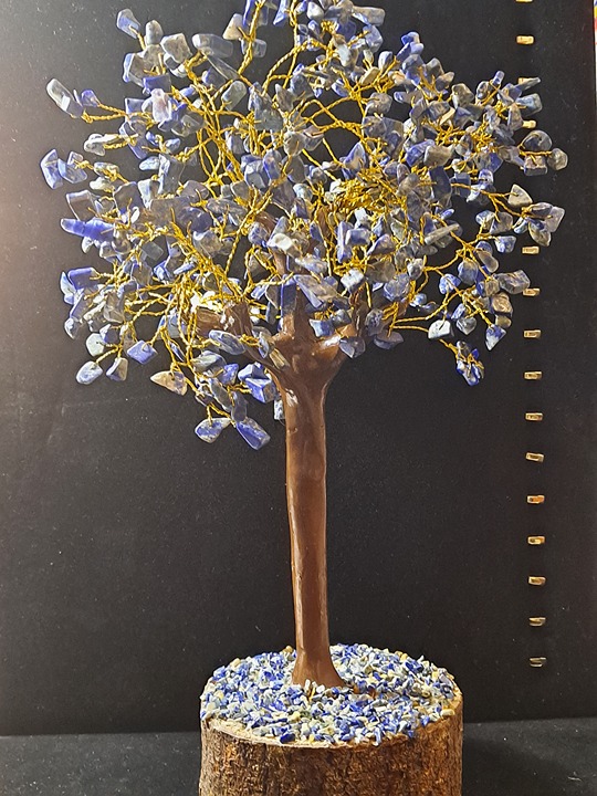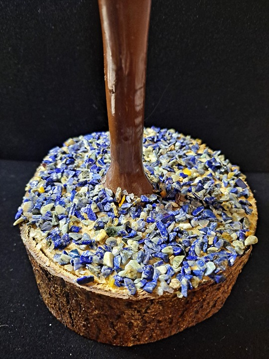 This handcrafted gemstone tree is a bold statement of wisdom and beauty. Standing an impressive 14 inches tall, it is rooted in a sturdy wood base covered with natural lapis lazuli pieces, creating a rich foundation that enhances the tree’s energy. Each branch is carefully shaped with wire and adorned with over 500 polished lapis lazuli gemstones, showcasing deep royal blues with golden flecks of pyrite.