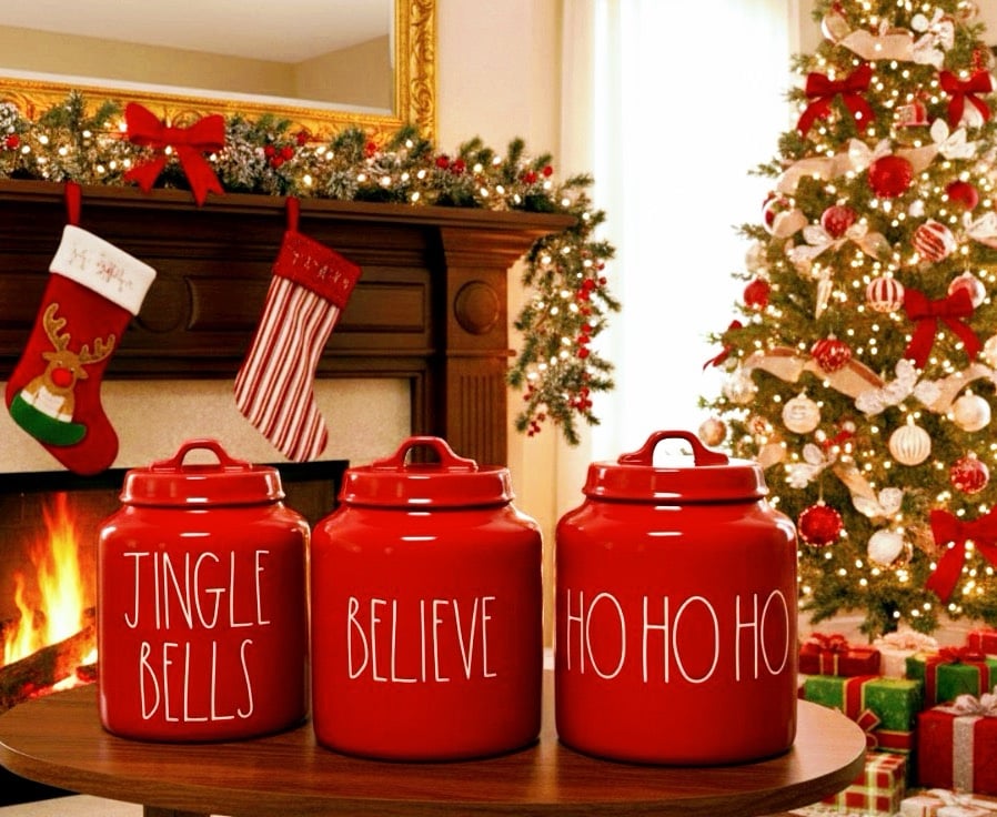 Rae Dunn Hohoho Believe and Jingle bells canisters